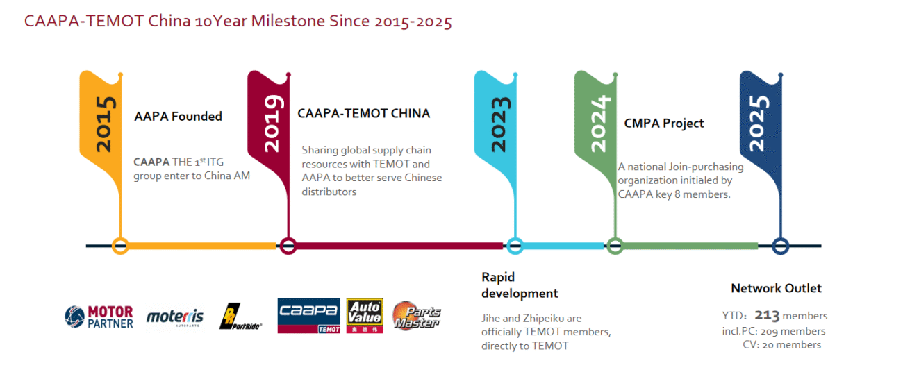 CAAPA became operational in January 2015 Right from the beginning CAAPA organized leading distributors strong with global brands US retail know-how with the Parts Master and Auto Value brand Under TEMOT’s leadership massive ROI increase to members Today more than 50 members (incl. sub-groups, we organize ca. 100 distributors) CAAPA covers 18 out of 34 provinces CAAPA consists out of B2B wholesalers with warehouses and shops on-site Some cooperate with e-commerce leaders.